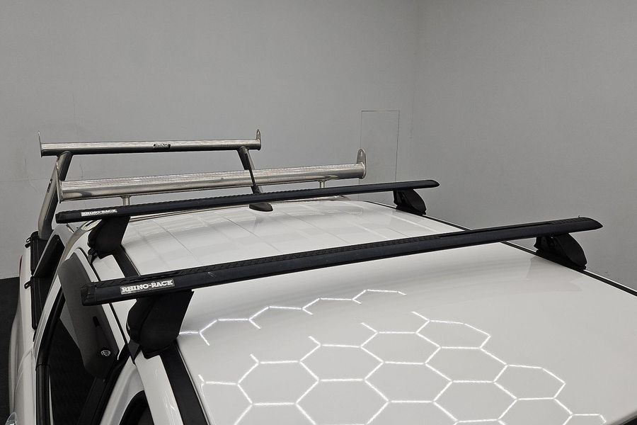 It boasts a sleek white exterior, complete with a bullbar, ladder racks, roof racks, and a towbar for all your hauling needs.